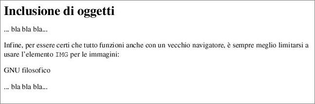 <H1>Inclusione di oggetti</H1> <P>... bla bla bla...</P> <P>Infine, per essere certi che tutto funzioni anche con un vecchio navigatore, è sempre meglio limitarsi a usare l'elemento <CODE>IMG</CODE> per le immagini:</P> <P><IMG SRC="philosophical-gnu-sm.jpg" ALT="GNU filosofico"></P> <P>... bla bla bla...</P>