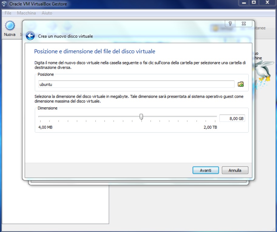 Nella schermata successiva (figura 3.5) si devono definire nome e grandezza del disco virtuale.