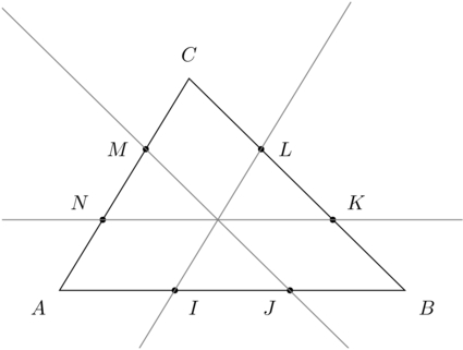 x = <COUNTER2> y = <COUNTER1> A = point(7*x,-7*y) AM = 4/11*x+16/11*y+1 MB = 6-AM A M I equilateral(AM) M B J equilateral(MB) draw(A,M,I) ; draw(M,B,J) color(lightgray) draw(segment(I,J)) color(black) draw(AM,"%.1f",segment(A,M),-90:) draw(MB,"%.1f",segment(M,B),-90:) color(blue) draw(barycenter(I,J)) color(black) |